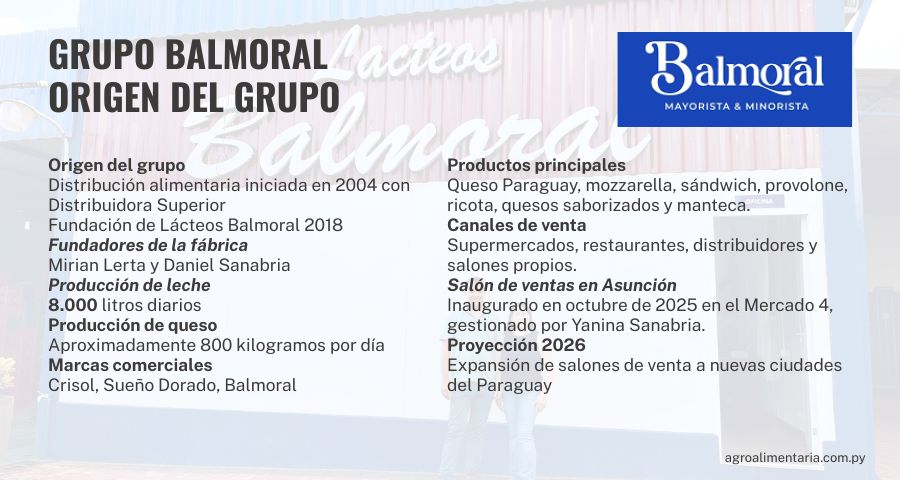 Con una propuesta basada en calidad, integración productiva y crecimiento sostenido, el Grupo Balmoral continúa consolidando su presencia dentro de la industria láctea paraguaya. A través de su empresa Lácteos Balmoral, el grupo ha desarrollado una estructura que abarca desde la producción hasta la distribución y comercialización de sus productos, posicionándose como un actor en expansión dentro del mercado nacional.